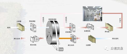 轉輪除濕機的工作流程可分幾個部分完成:預冷 / 預熱( 供選件 ) — 轉輪除濕 —后冷 后熱( 供選件