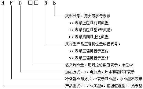 型號舉例:HF19N 表示名義制冷量為19kW的壓縮機置于室內的風冷型單元式空調機組。